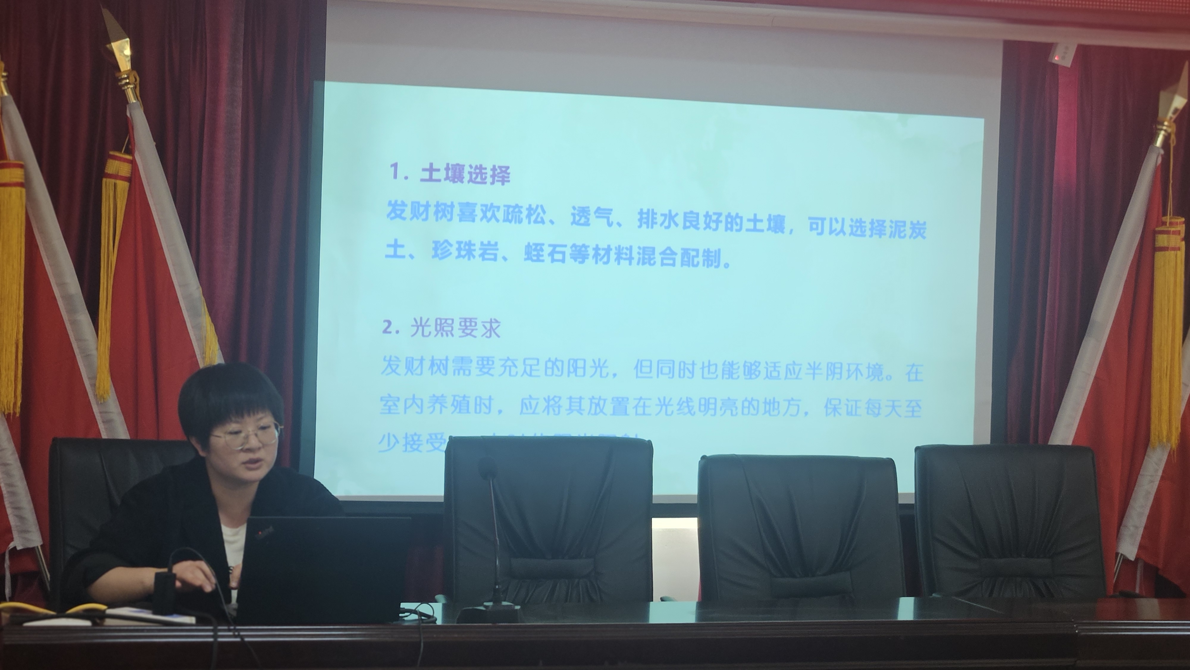 授课专家从发财树种植的土壤选择、水肥管理、温度控制和光照选择等方面进行深入阐述,帮助学员掌握种植技术。