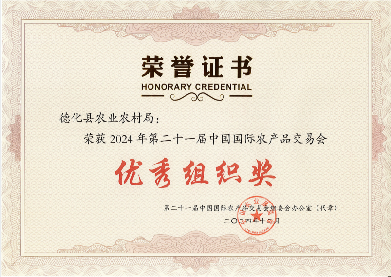 中国绿色食品发展中心首次设立的“绿色有机地标农产品”展区,我县德化黑鸡等8个农产品荣获第二十一届农交会“绿色有机地标农产品”展区最佳展品奖;德化黑兔、德化黄花菜、戴云农家德化黑鸡3个产品荣获2024年第二十一届中国国际农产品交易会最受欢迎产品奖;县农业农村局荣获2024年第二十一届中国国际农产品交易会优秀组织奖。